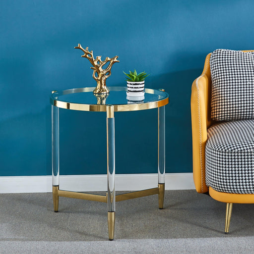 Artisan Design FurnitureEND TABLE 8 MM CLEAR TEMPERED GLASS/ACRYLIC/STAINLESS STEEL/GOLD FINISH OVERALL SIZE: 23.6"Lx23.6"Dx24"H ASSEMBLY REQUIRED