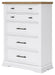 Casual style with substance. This two-tone chest of drawers raises the bar on comfortably cozy design in your soothing sanctuary. A sturdy silhouette with a classic white finish and black metal hardware exudes modern farmhouse vibes. The butcher block oak veneer top adds a relaxed aesthetic. And this charmingly curated piece is spacious enough for all your essentials.