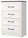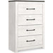 Cool, clean and casually modern. This chest’s wispy whitewash and gray finish sets the tone for your calming sanctuary. Large linear pulls add dimension and authenticity. Four smooth-gliding drawers neatly accommodate your wardrobe needs.
